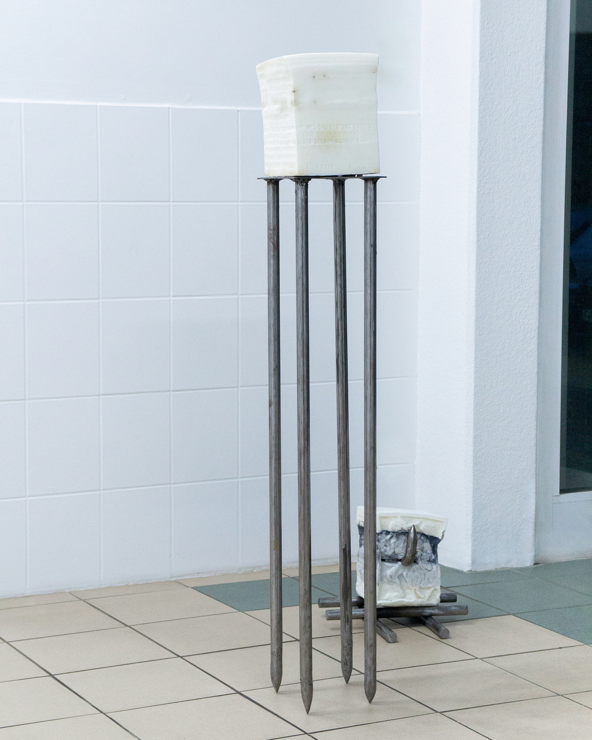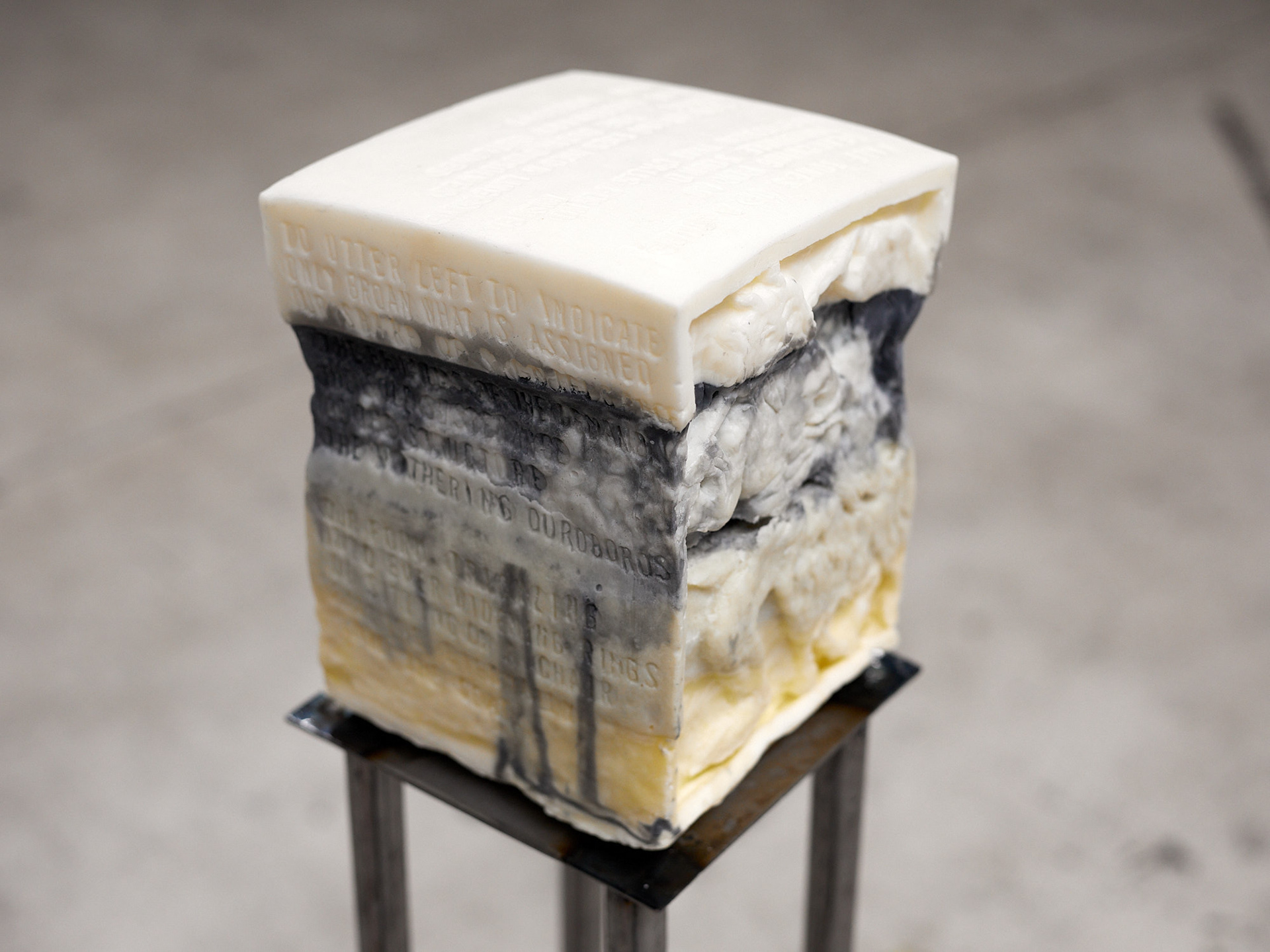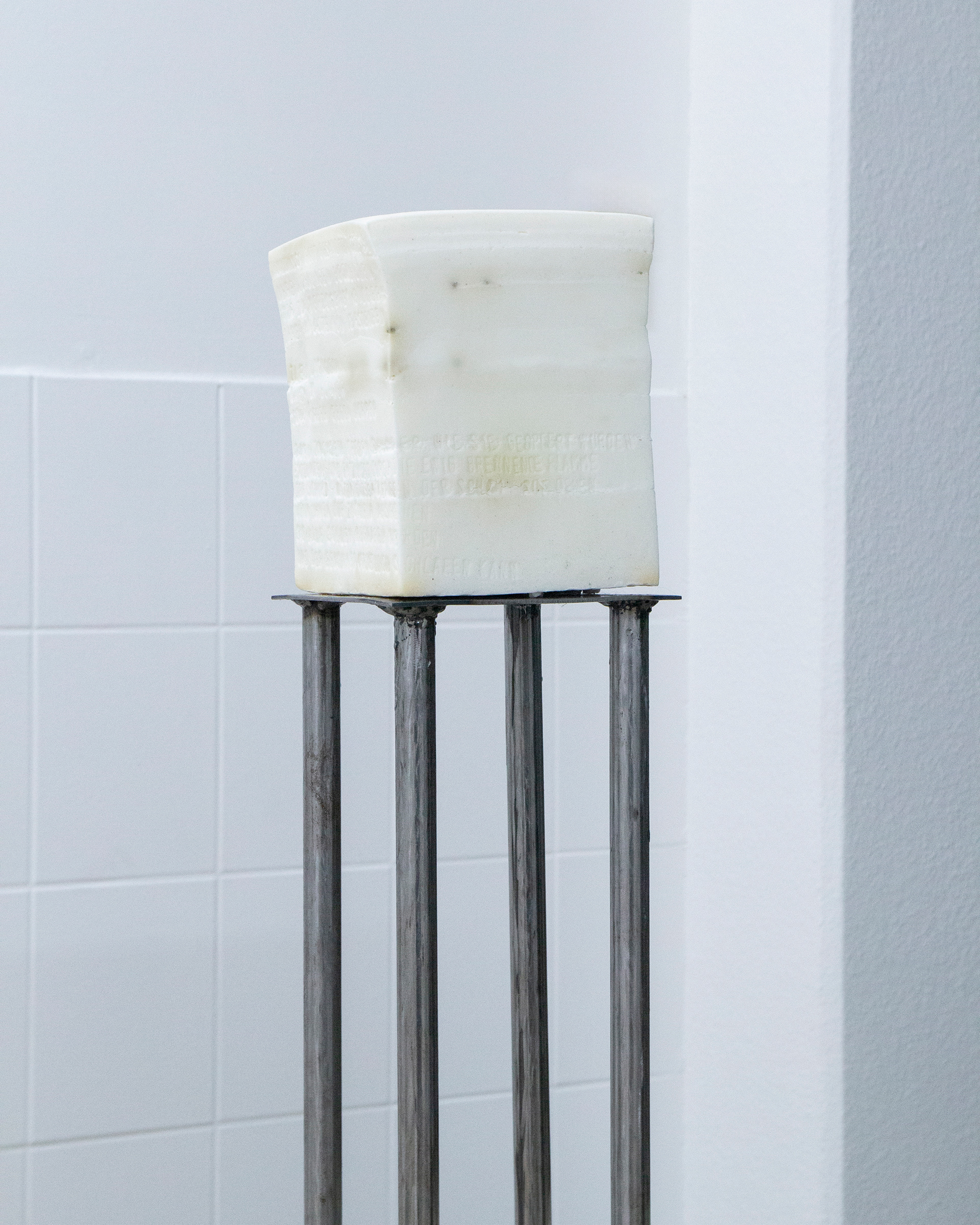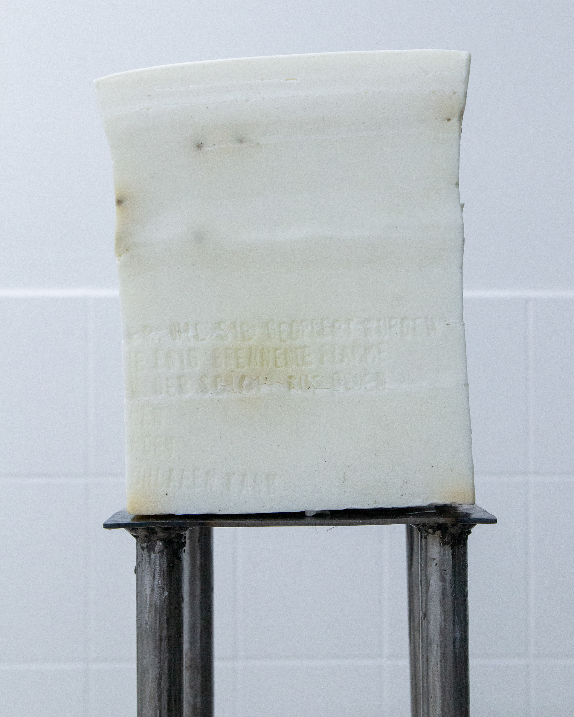 By inscribing poetry and mythological imagery into the surface of the sculptures, the artist materializes cycles of guilt, memory, and survival. Representative of Rosalind Kraus’ Formlessness, the material degradation of the soap becomes an act of resistance against rigid systems, mirroring the instability of power structures that seek to define purity and impurity. The scapegoat soaps are the personification of Julia Kristeva’s Abject, evoking both repulsion and an uncanny attraction.