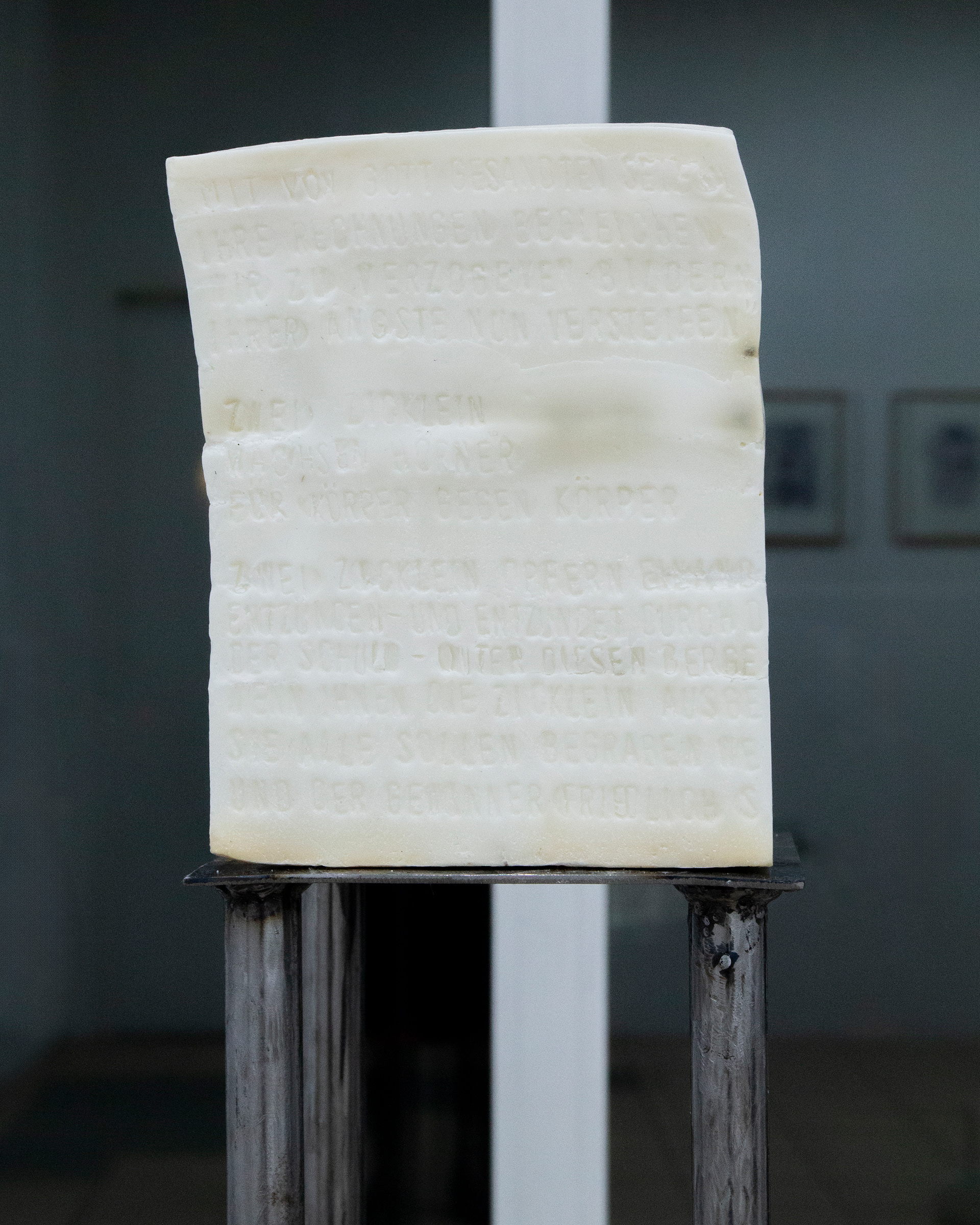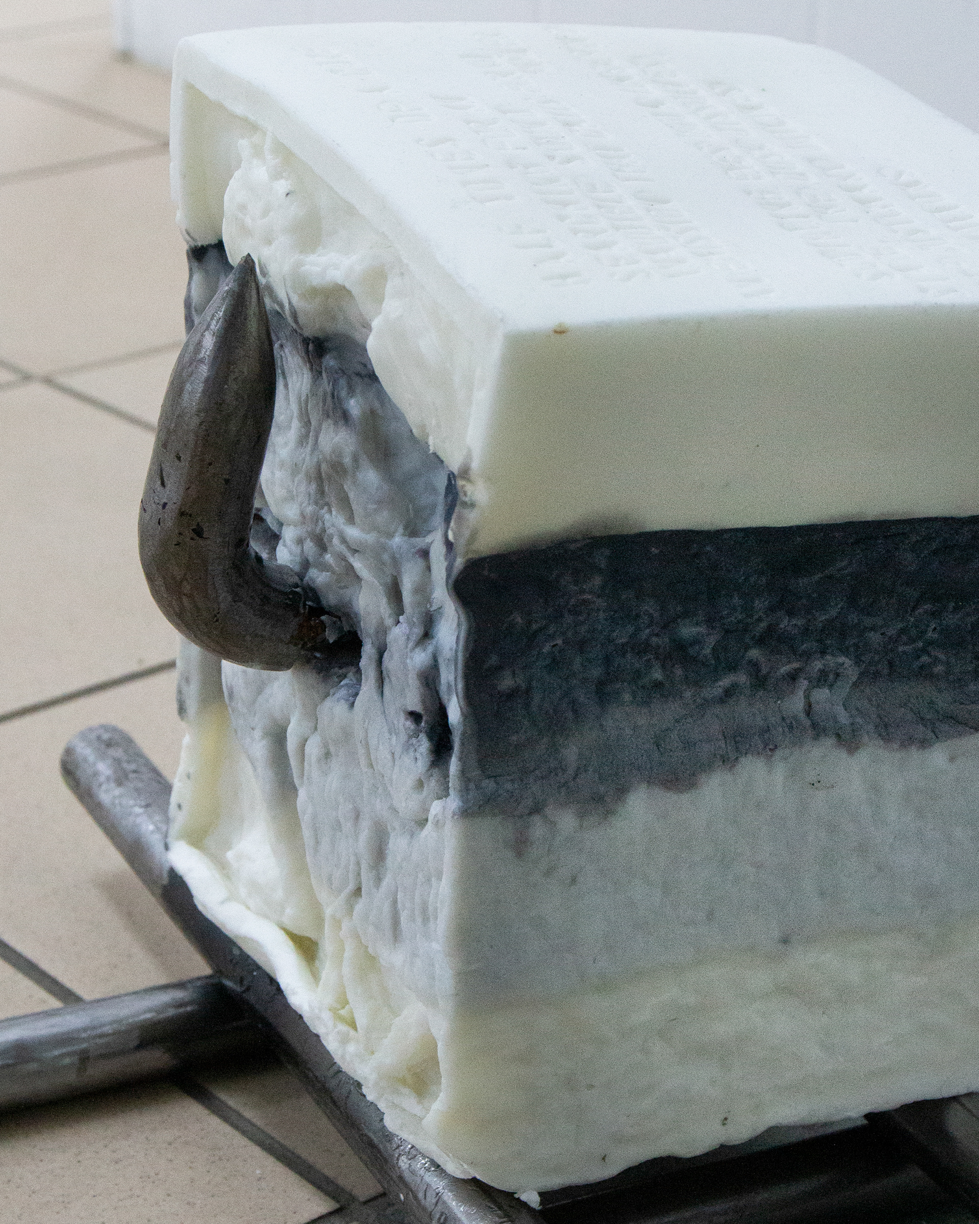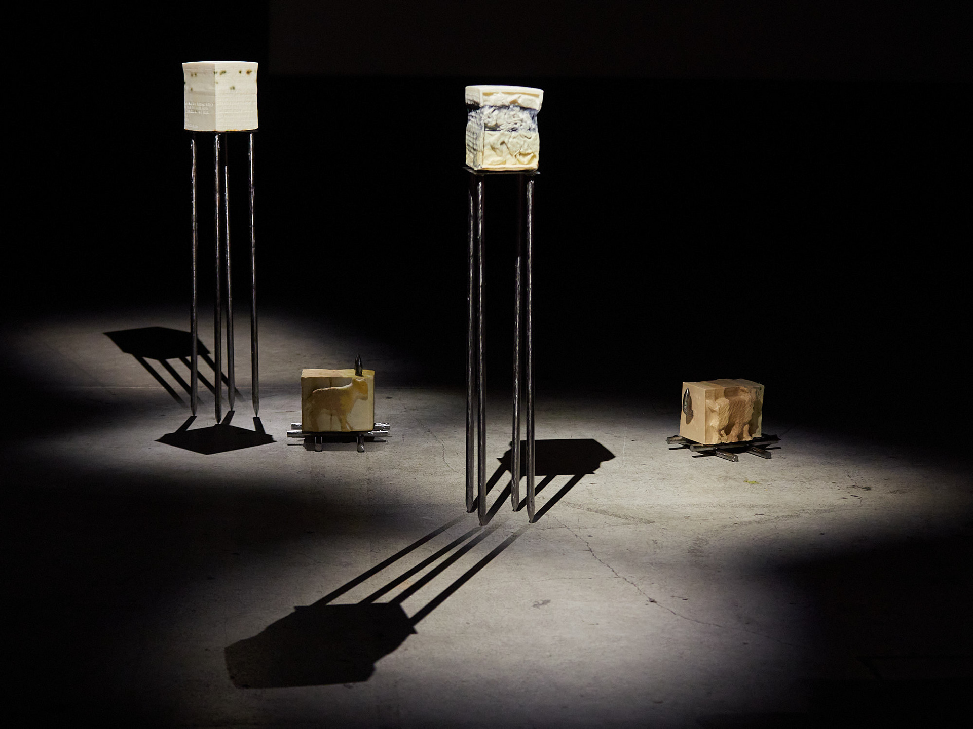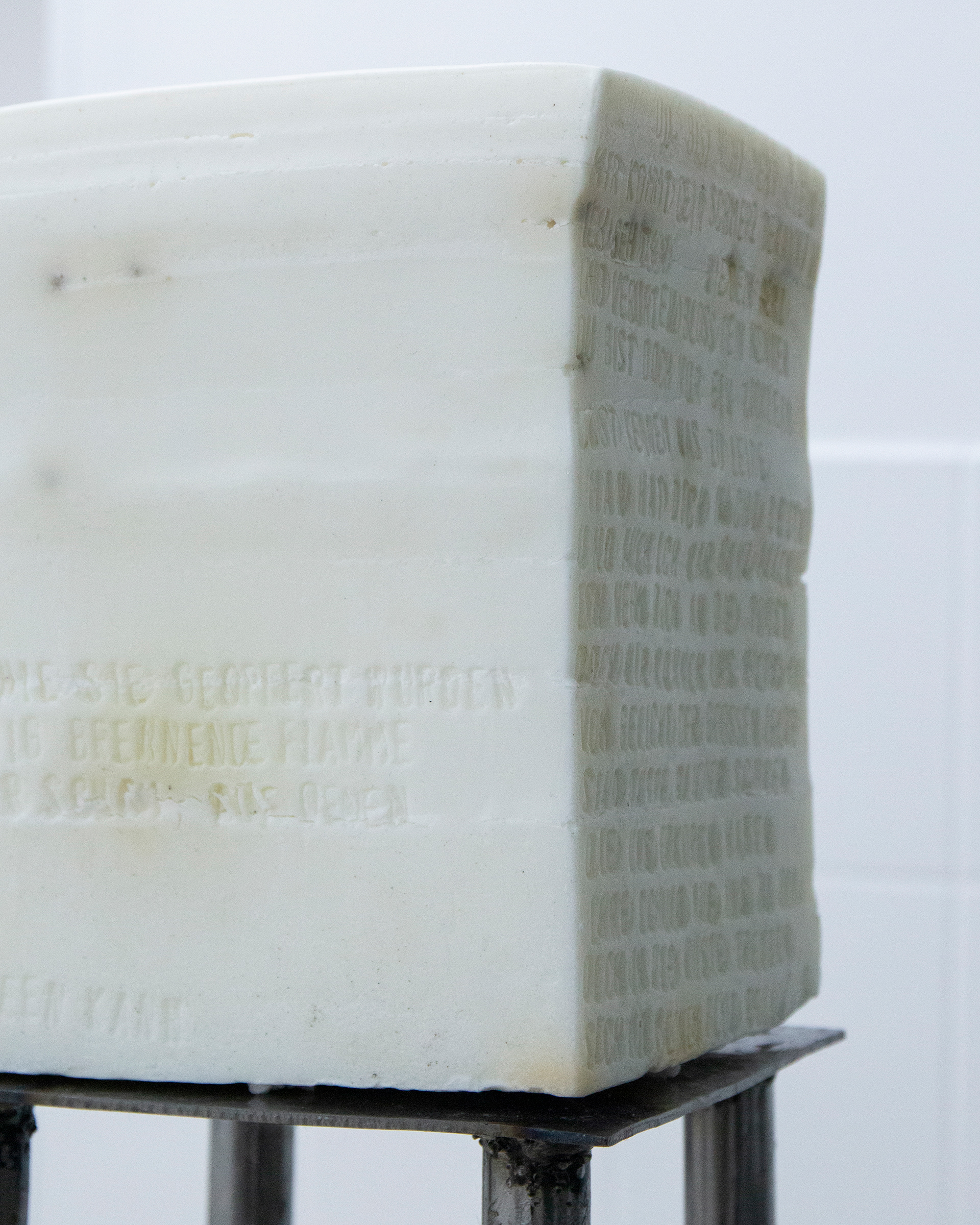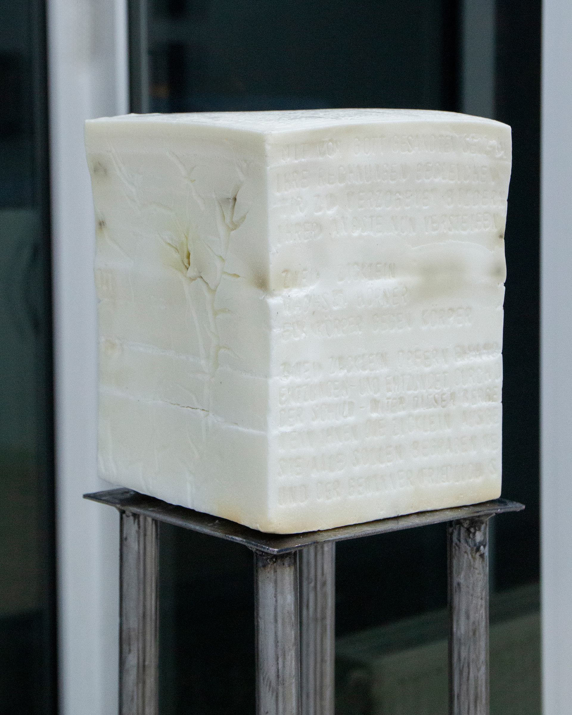 By inscribing poetry and mythological imagery into the surface of the sculptures, the artist materializes cycles of guilt, memory, and survival. Representative of Rosalind Kraus’ Formlessness, the material degradation of the soap becomes an act of resistance against rigid systems, mirroring the instability of power structures that seek to define purity and impurity. The scapegoat soaps are the personification of Julia Kristeva’s Abject, evoking both repulsion and an uncanny attraction.