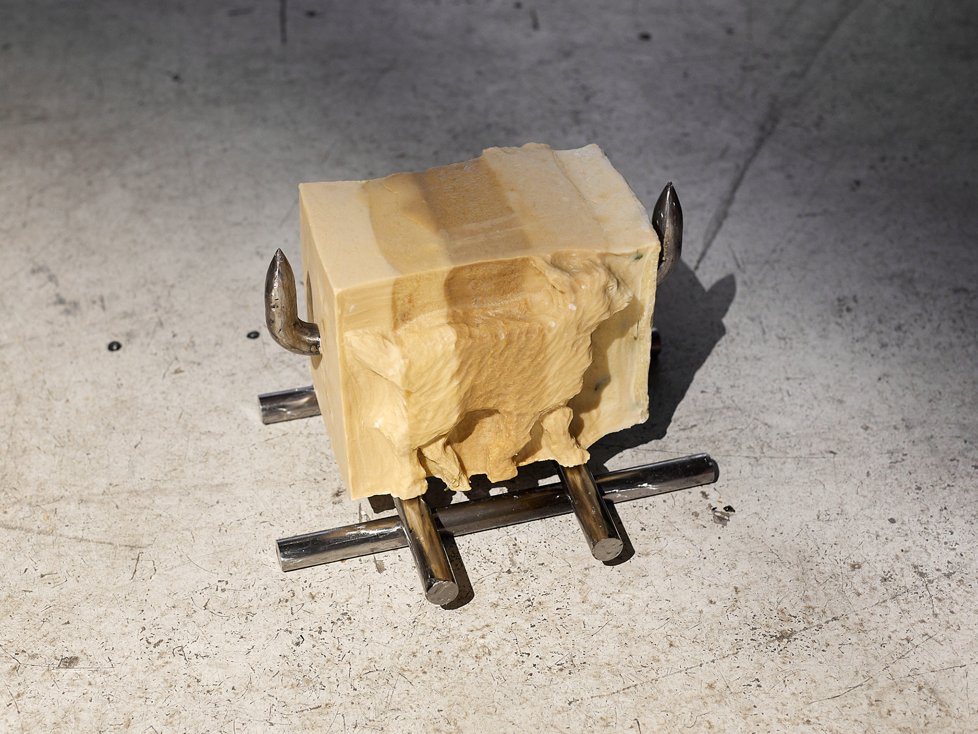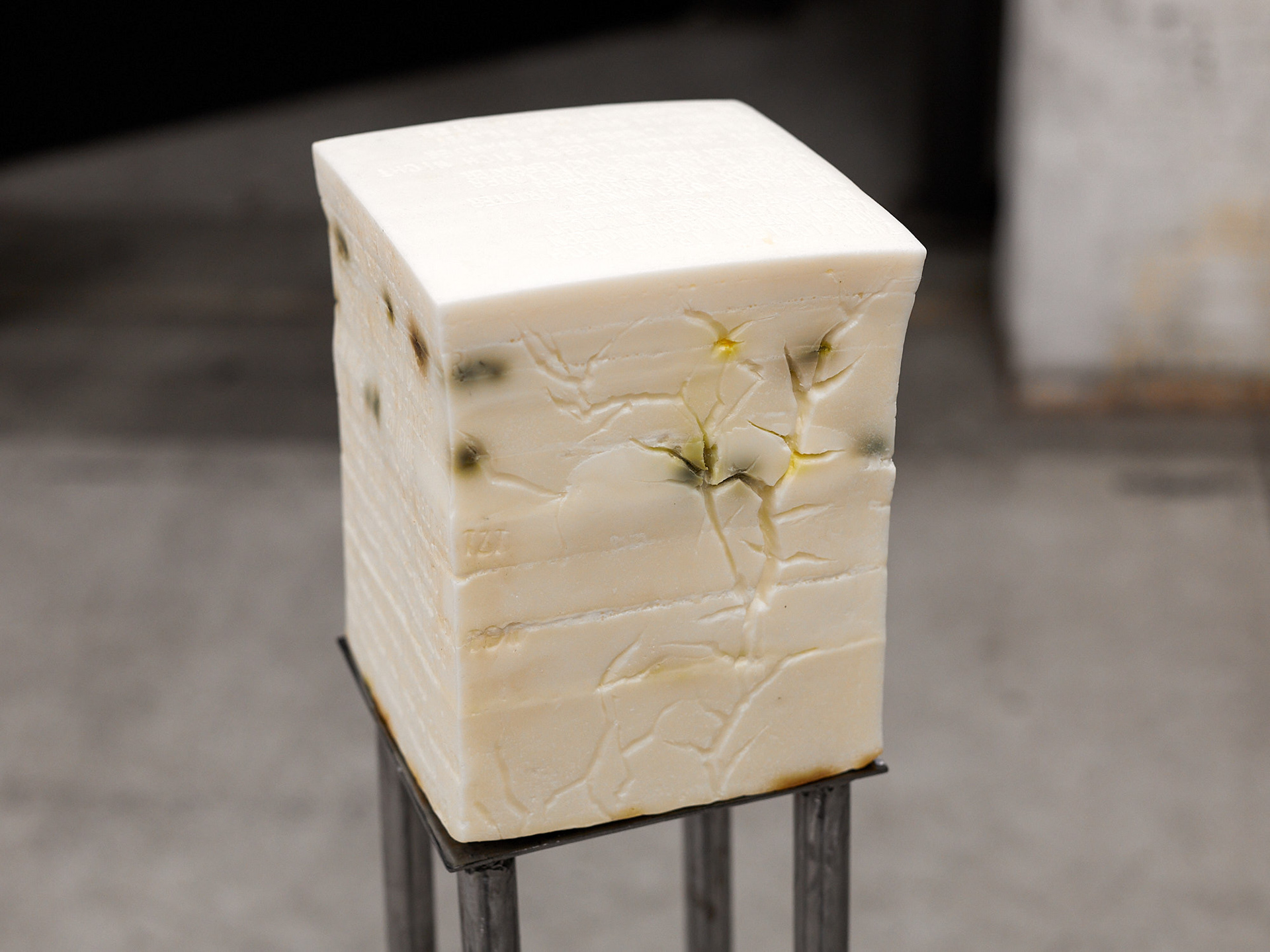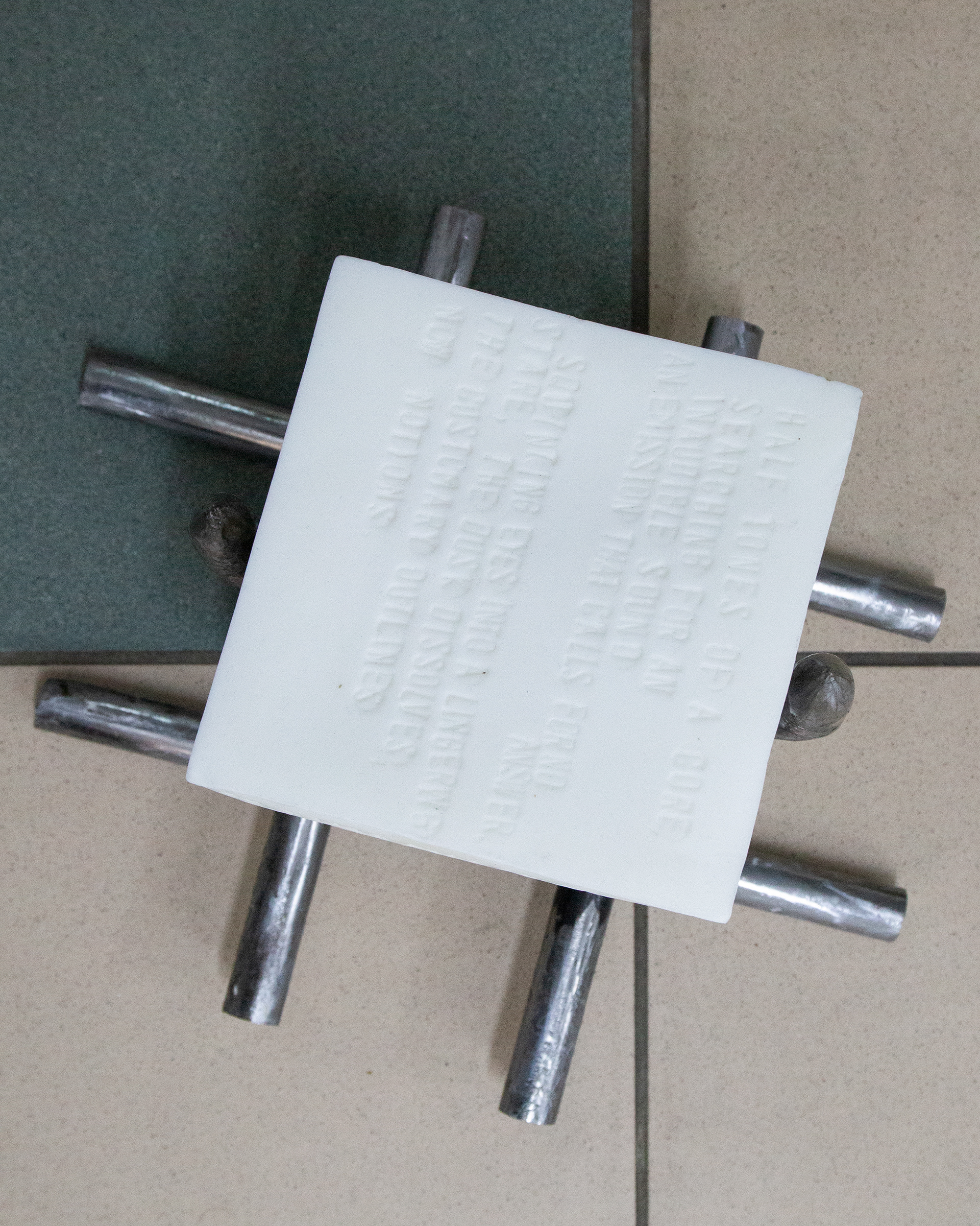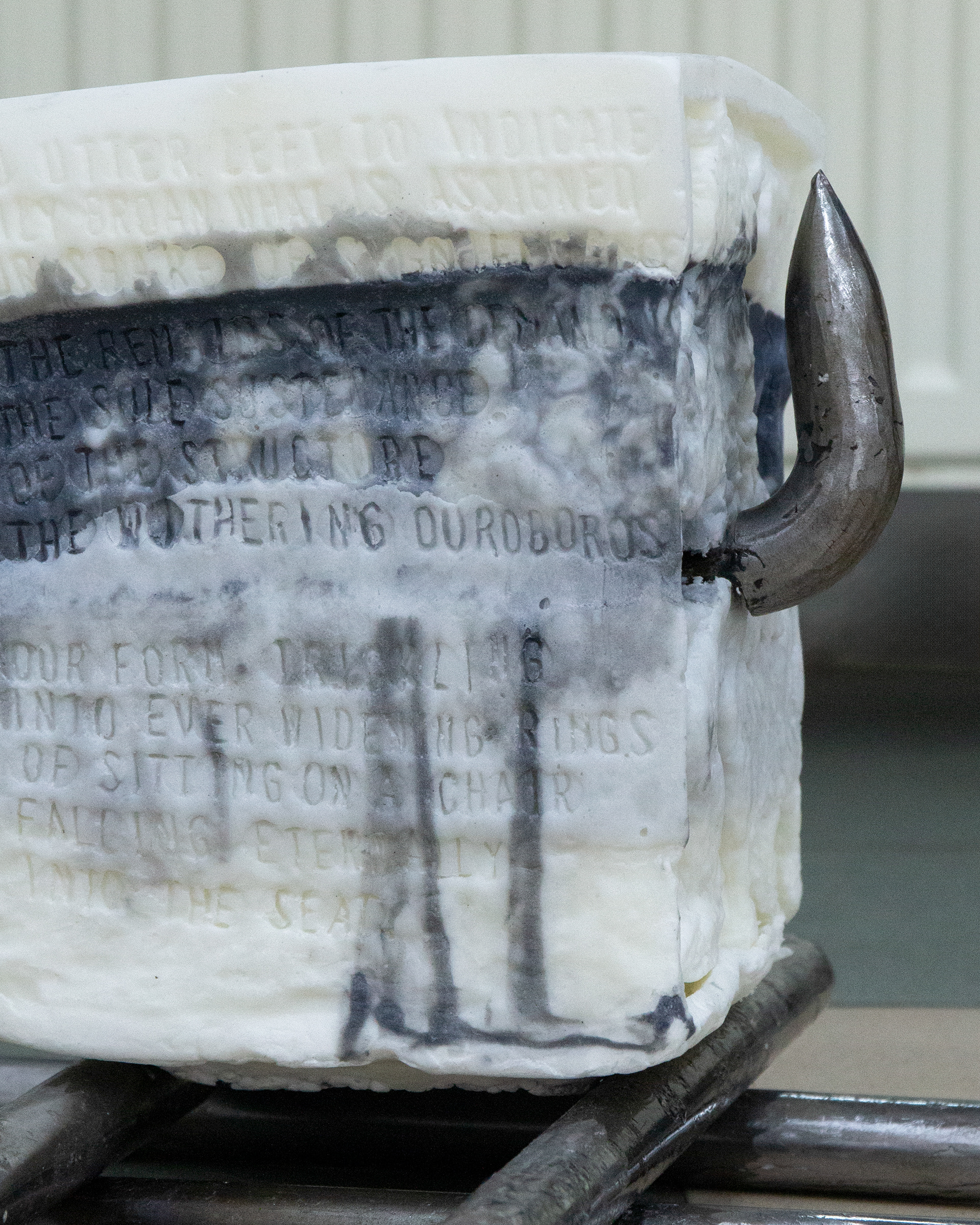 By inscribing poetry and mythological imagery into the surface of the sculptures, the artist materializes cycles of guilt, memory, and survival. Representative of Rosalind Kraus’ Formlessness, the material degradation of the soap becomes an act of resistance against rigid systems, mirroring the instability of power structures that seek to define purity and impurity. The scapegoat soaps are the personification of Julia Kristeva’s Abject, evoking both repulsion and an uncanny attraction.