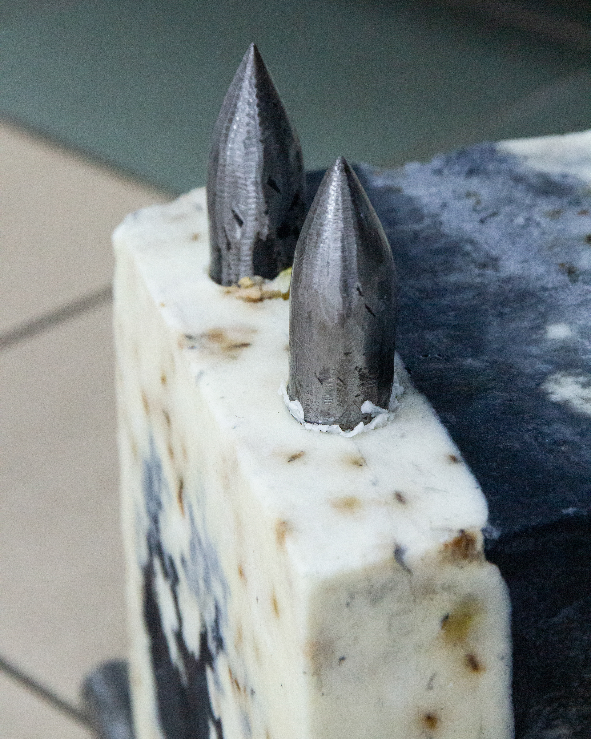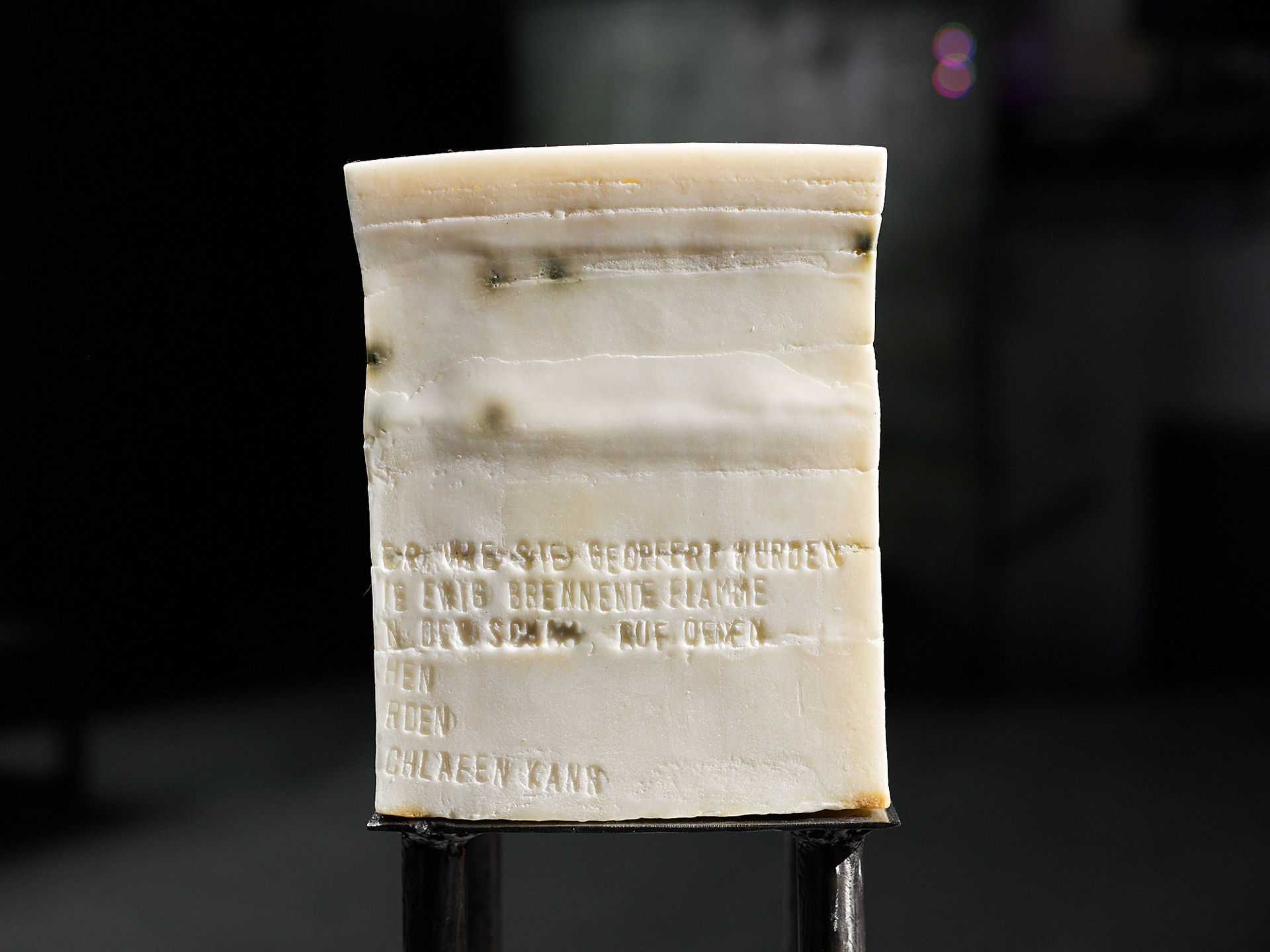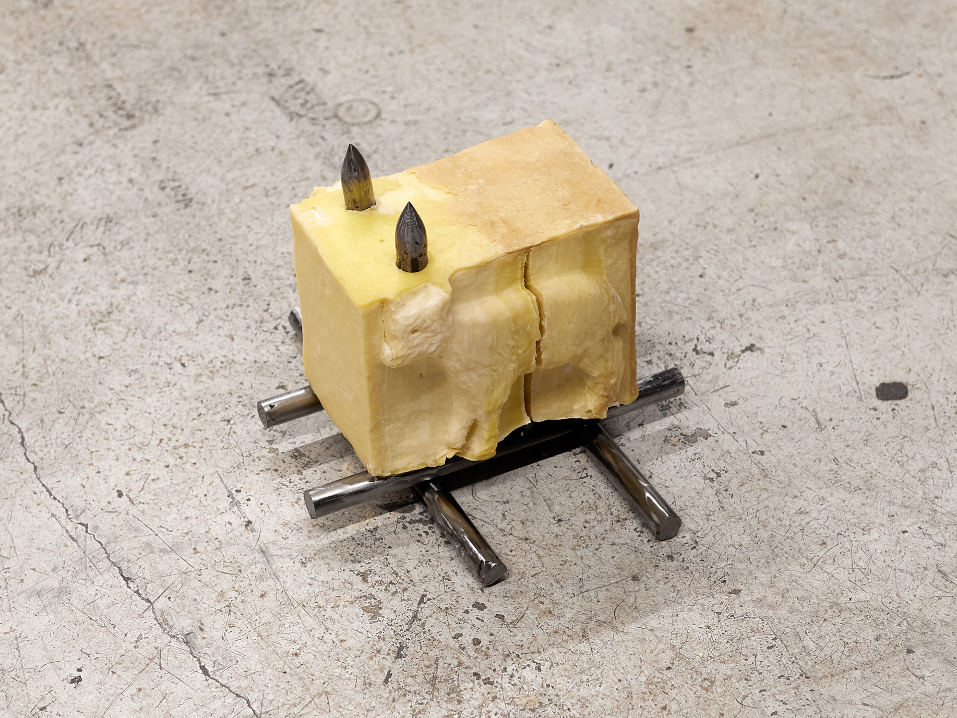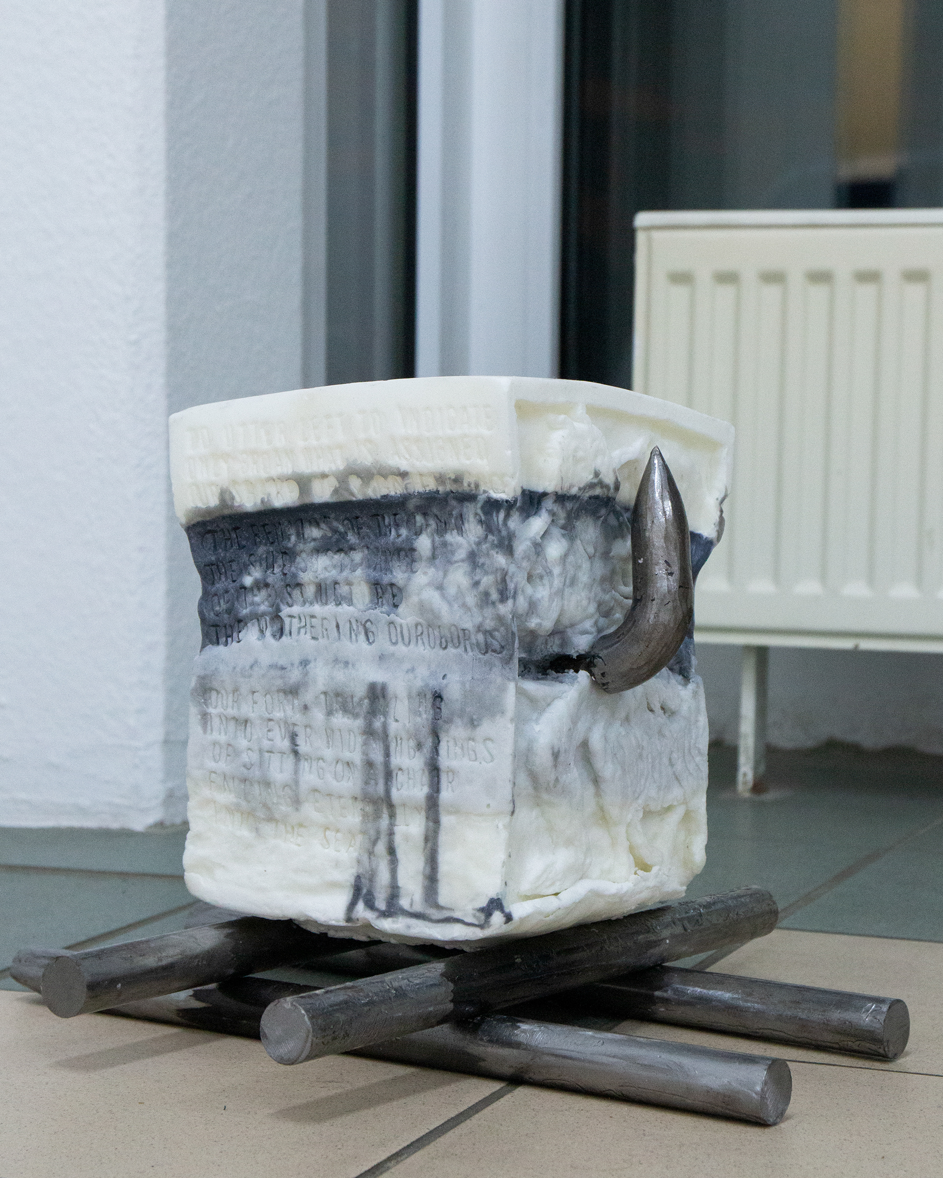 By inscribing poetry and mythological imagery into the surface of the sculptures, the artist materializes cycles of guilt, memory, and survival. Representative of Rosalind Kraus’ Formlessness, the material degradation of the soap becomes an act of resistance against rigid systems, mirroring the instability of power structures that seek to define purity and impurity. The scapegoat soaps are the personification of Julia Kristeva’s Abject, evoking both repulsion and an uncanny attraction.